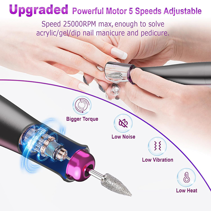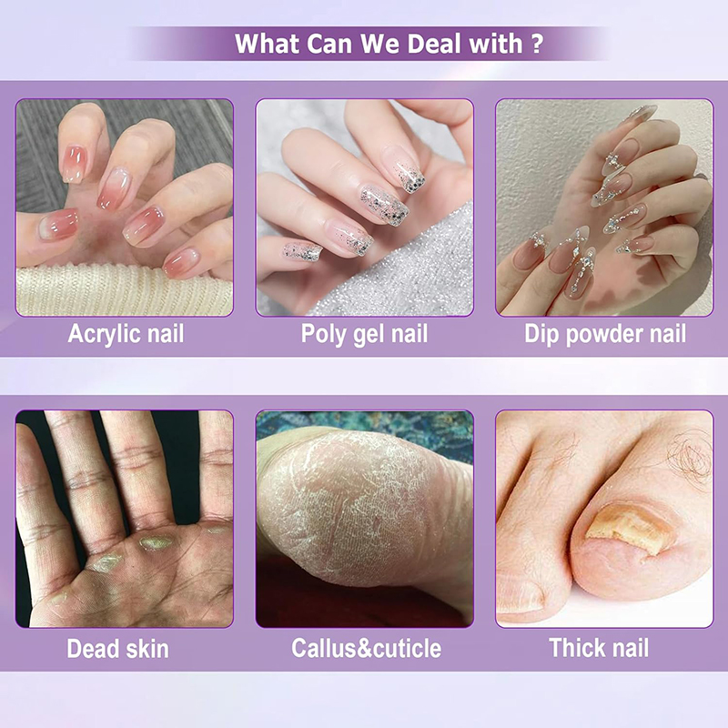 Elektrikli tırnak matkap makinesi Yükseltilmiş güçlü motor, akrilik tırnakların, Poli jel tırnakların, böcek jelinin, daldırma tozu tırnakların, tırnak etlerinin, ölü derinin, nasırların ve kalın tırnakların çıkarılması da dahil olmak üzere tüm Manikür ve Pedikür ihtiyaçlarınız için mükemmeldir.