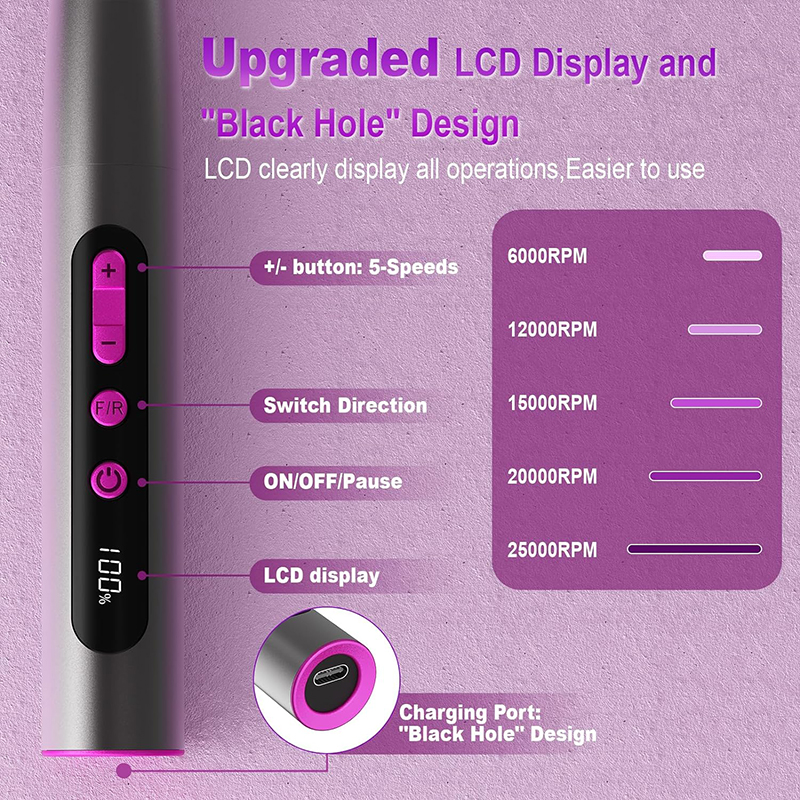 LCD ekranlı Profesyonel Tırnak Matkap, 25000 rpm'ye kadar 5 ayarlanabilir hız, kablosuz şarj edilebilir tasarım, 6 saate kadar pil ömrü. Her şeyi içeren akrilik tırnak seti, 11 adet farklı fonksiyona sahip tırnak matkap ucu, 36 adet zımpara bandı, 1 adet toz kalkanı ve 1 adet USB şarj kablosu ile birlikte gelir. Paskalya yaklaşırken kendinize güzel bir tırnak sanatı yapın!