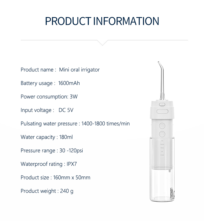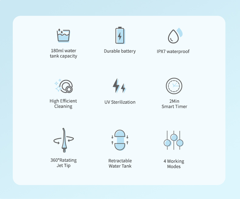 Bu su ipi diş ipi, dakikada 1400-1800 kez yüksek su basıncı darbeleri vererek derin diş temizliği için diş plağının ,9'unu etkili bir şekilde temizler. Bu su ipi diş ipi diş ipi, diş etlerine masaj yapar, kan dolaşımını destekler ve kötü nefes, ortodontik dişler gibi ağız sorunlarını giderir
