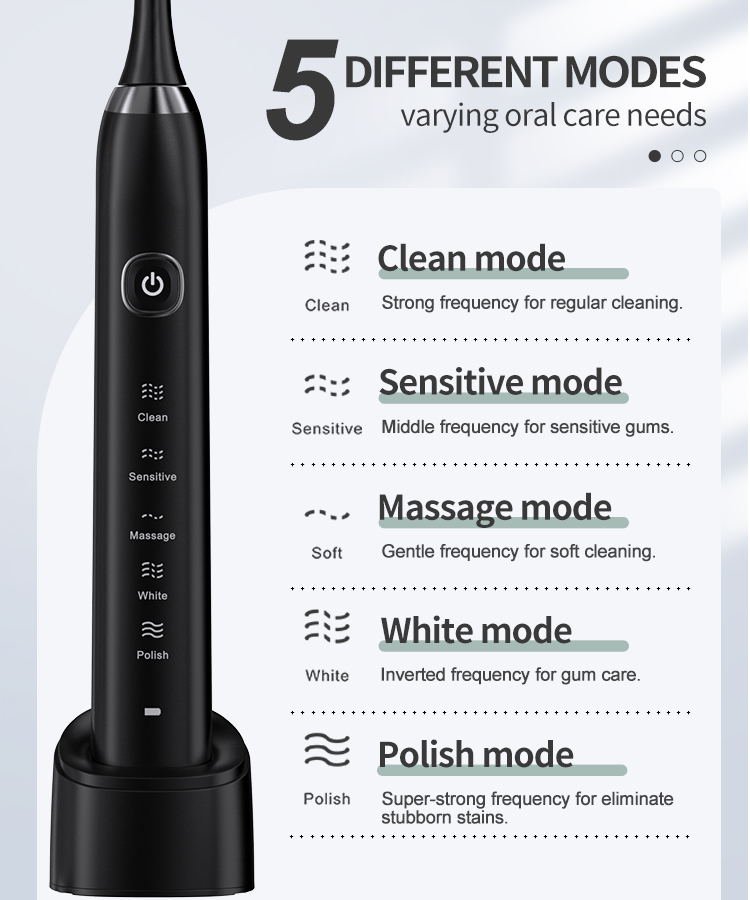 - 5 YÜKSEK PERFORMANSLI FIRÇALAMA MODU - Temiz (yumuşak), Beyaz (güçlü), Cilalı (güçlü ters frekans), Yumuşak (yumuşak ters frekans) ve Hassas (yumuşak) diş ve diş eti durumlarına uygun şekilde tasarlanmıştır, böylece tercihlerinize ve diş hekiminizin önerilerine göre farklı modlar seçebilirsiniz.