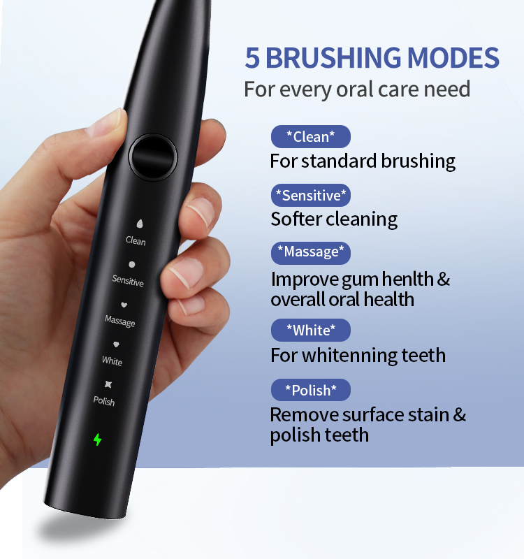 - 5 YÜKSEK PERFORMANSLI FIRÇALAMA MODU - Temiz (yumuşak), Beyaz (güçlü), Cilalı (güçlü ters frekans), Yumuşak (yumuşak ters frekans) ve Hassas (yumuşak) diş ve diş eti durumlarına uygun şekilde tasarlanmıştır, böylece tercihlerinize ve diş hekiminizin önerilerine göre farklı modlar seçebilirsiniz.